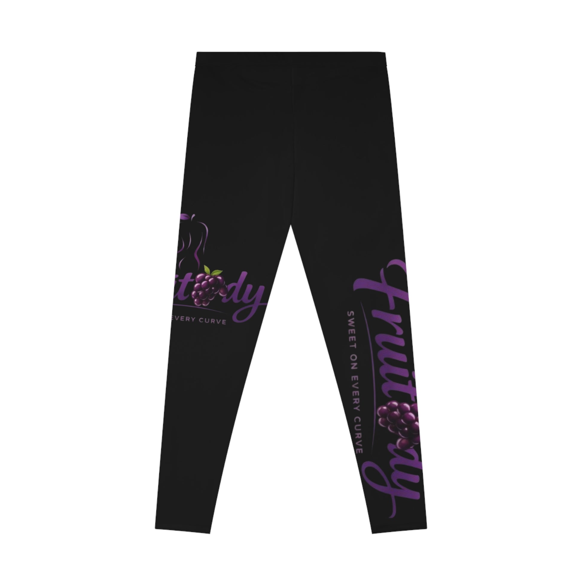 These ankle-length leggings bring bold, playful style to everyday movement. The deep black canvas makes the purple script and grape cluster accents pop—subtle from a distance, vivid up close. The mid-rise, thin elastic waistband sits comfortably without digging in, while the smooth, seam-minimized construction hugs curves and moves with you. Lightweight yet substantial, the fabric feels soft and stretchy, returning its shape after wear. Wear them to stretch, run errands, or pair with an oversized sweater for an evening out—the design reads like a wink: confident, fun, and a little fruity.