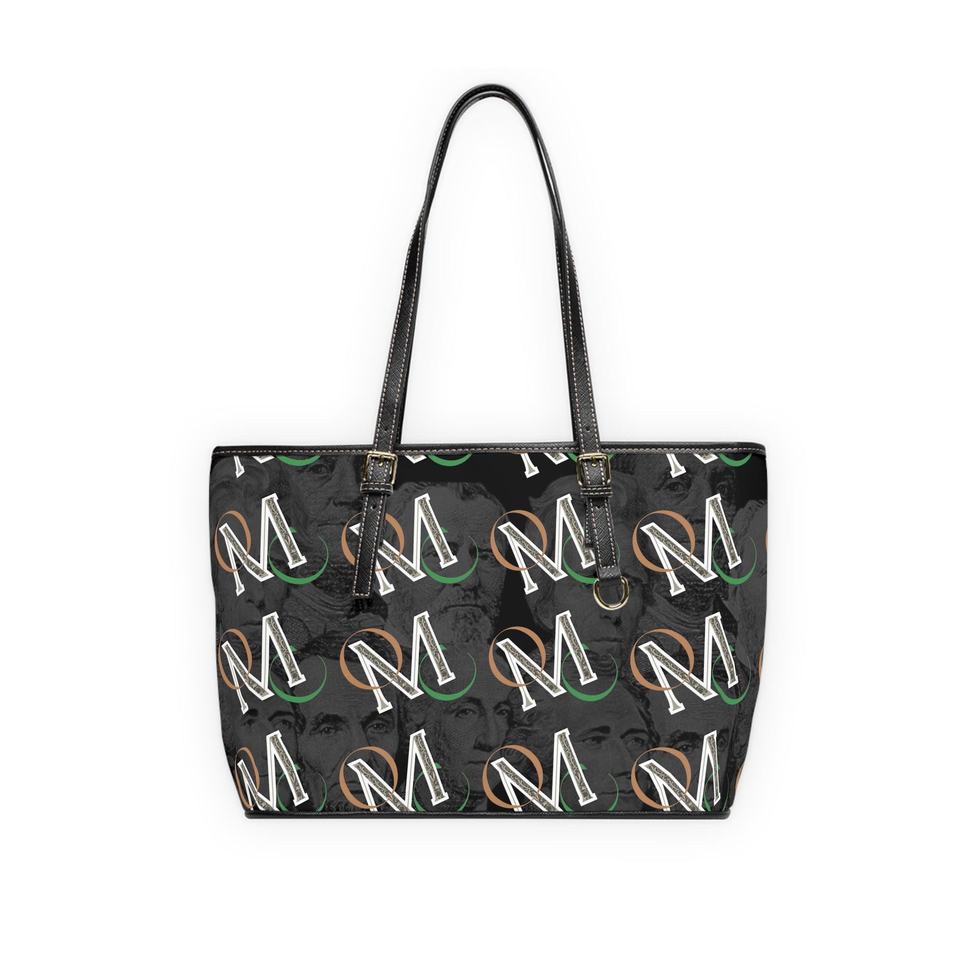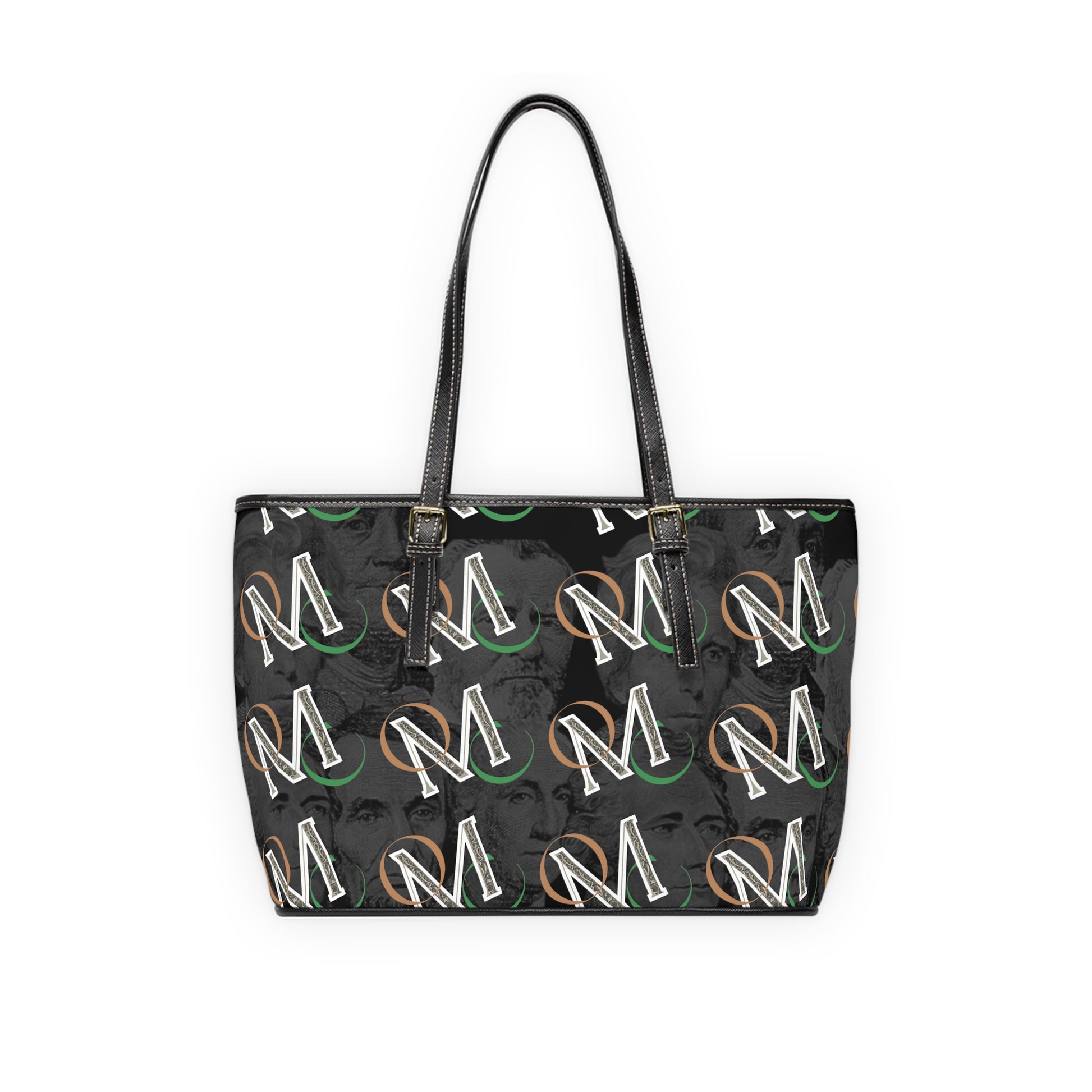 A sleek PU leather shoulder bag that balances bold personality with everyday practicality. The dark, double-sided print layers historic presidential portraits in charcoal tones, while warm gold script adds subtle contrast and a touch of attitude. Adjustable straps let you wear it at the length you want, while a zippered inner pocket and two open pockets keep phone, keys, and small essentials organized. The polyester lining and gold-colored hardware give it a refined finish that wears confidently from morning commute to evening plans.