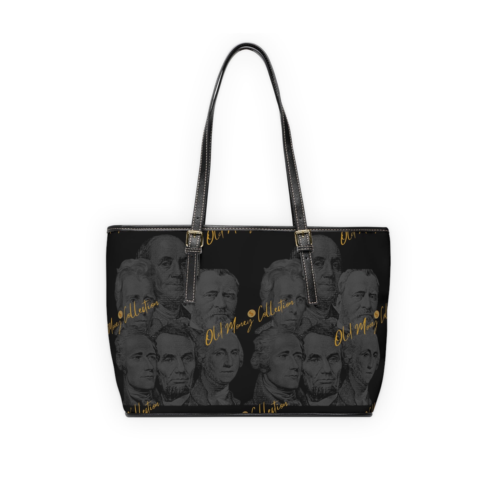 A sleek PU leather shoulder bag that balances bold personality with everyday practicality. The dark, double-sided print layers historic presidential portraits in charcoal tones, while warm gold script adds subtle contrast and a touch of attitude. Adjustable straps let you wear it at the length you want, while a zippered inner pocket and two open pockets keep phone, keys, and small essentials organized. The polyester lining and gold-colored hardware give it a refined finish that wears confidently from morning commute to evening plans.